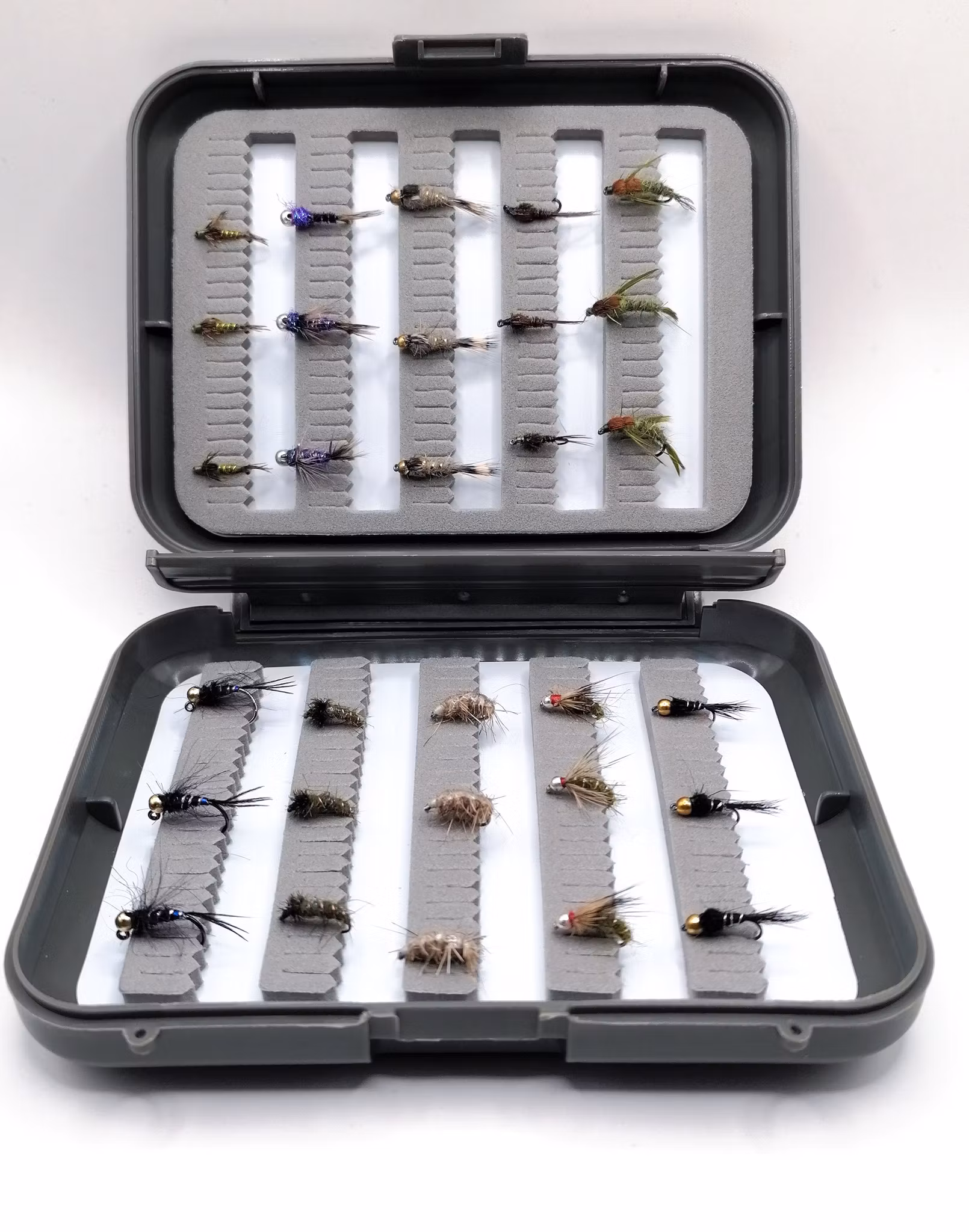 Ask innehållande 30 stycken blandade flugor. Alla flugor med hullingfri krok. Exempel på innehåll finns i bild. OBS askarna skiljer sig åt när det gäller innehåll. Det är olika flugor i askarna. Blandningen är från våra flugor med hullinglös krok.